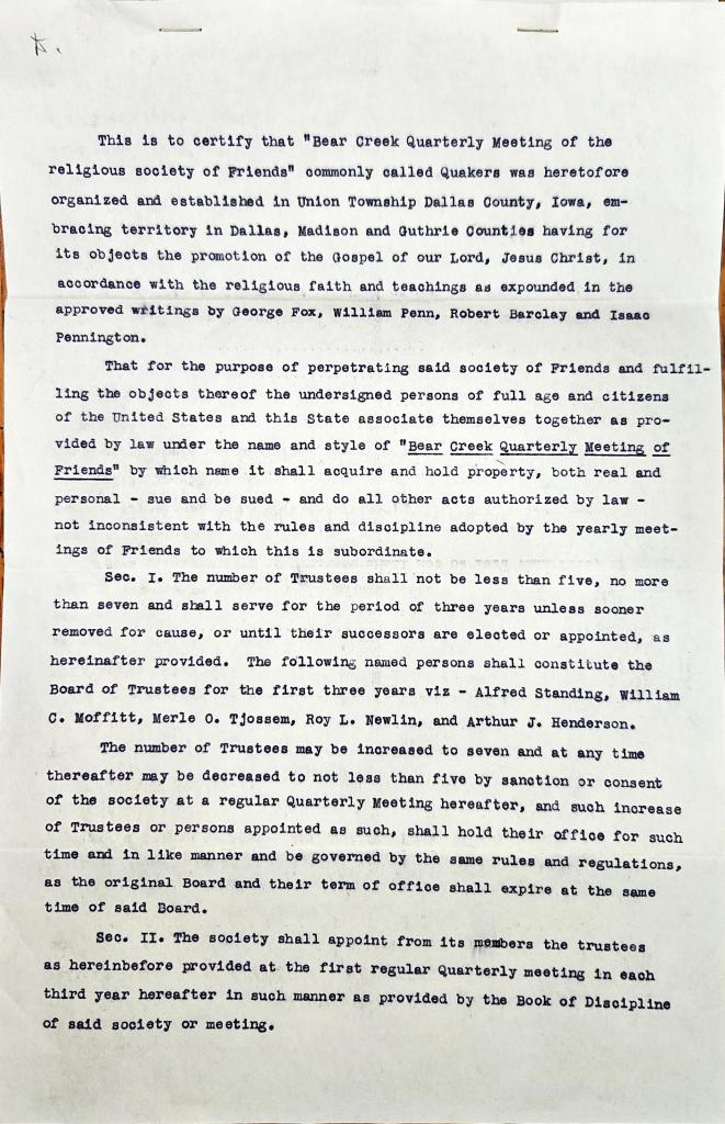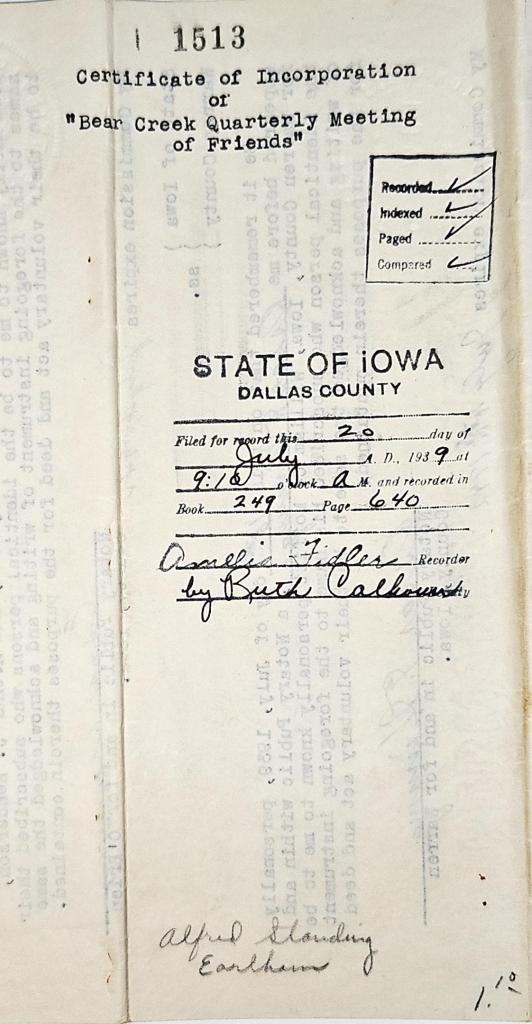Certificate of Incorporation of Bear Creek Quarterly Meeting of Friends 1939